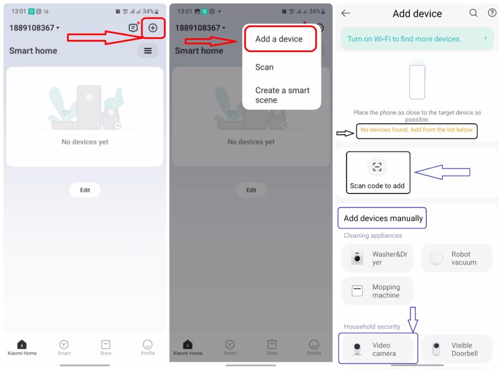 قدم ششم : پس از پیمودن مراحل ذکر شده و وارد شدن به برنامه Xiaomi Home برای متصل کردن دوربین خود مطابق شکل زیر مرحله به مرحله در سه قدم پیش می رویم: