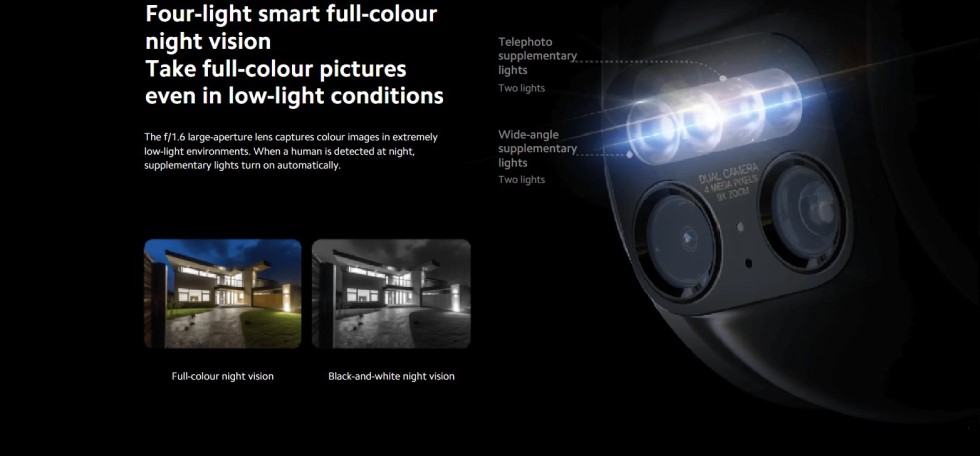 این دوربین هوشمند همچنین از چهار نور بهره برده است تا تصاویر تمام رنگی در شب را برای شما فراهم کند و عملکرد لنز f/1.6 با دیافراگم بزرگ تصاویر را در محیط هایی با نور کم تمام رنگی می گیرد و در حین مشاهده و شناسایی یک انسان در شب هم چراغ های تکمیلی به صورت خودکار روشن می شوند.
