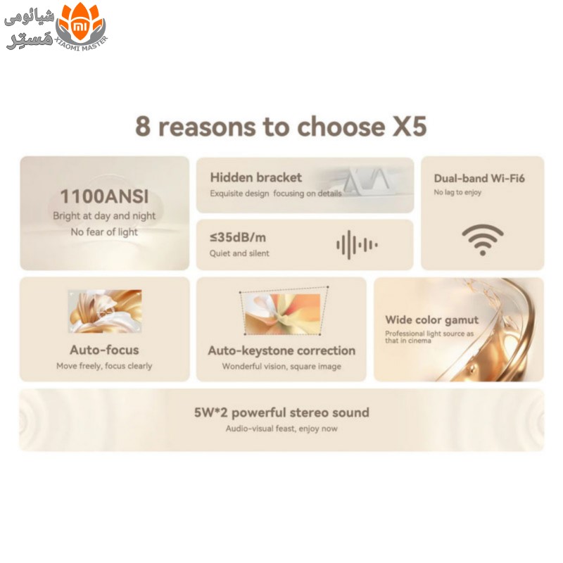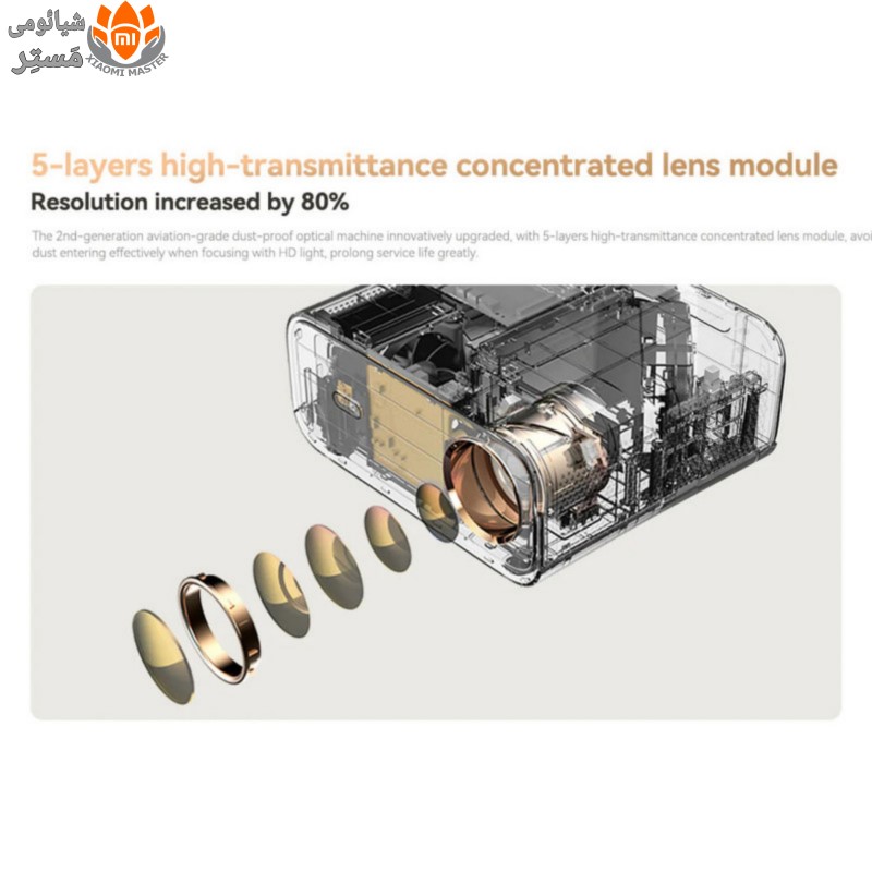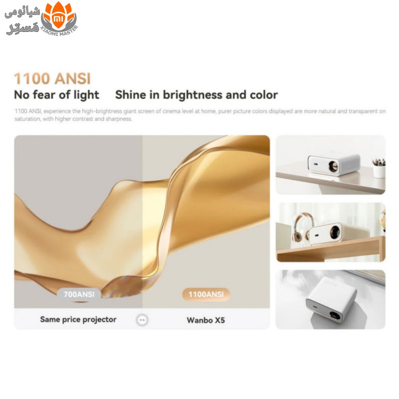 ویدئو پروژکتور ونبو مدل Wanbo X5 از یک طراحی شکیل و با رنگ های سفید و طلایی بهره برده و ترکیبی عالی از عملکرد و طراحی است. این ویدئو پروژکتور با برخوداری از روشنایی 1100 انسی لومن و کیفیت تصویر 1920 در 1080 پیکسل و همچنین پشتیبانی از فناوری HDR10 به همراه محتوای 4K و نسبت کنتراست 2500:1 تصویری با کیفیت بسیار بالا را به شما ارائه می دهد.